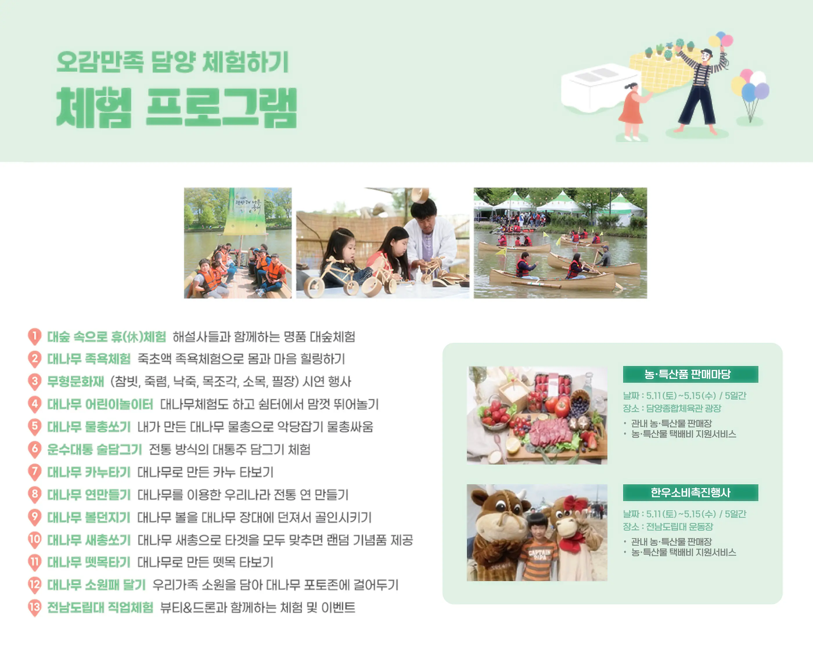 이 외에도 담양군 특산물 판매장, 플리마켓, 푸드트럭존 등도 마련되어 축제의 분위기를 한층 더 풍성하게 만들어줍니다. 인스타그램용 포토존도 다양하게 배치되어 SNS 인증숏을 남기기에도 제격입니다.