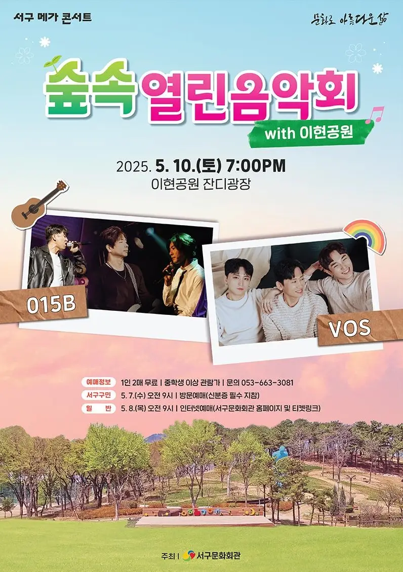 숲속에서 펼쳐지는 감성의 하모니, 따뜻한 5월의 저녁 바람결 따라 퍼지는 음악의 향연이 이현공원의 잔디광장에서 펼쳐집니다. 국민 최초의 프듀서 그룹으로 음악의 르네상스를 이끈 '015B'와 감성 발라드의 대표 그룹 'V.O.S'가 한자리에 모여 추억을 소환하는 명곡들로 여러분을 초대합니다. 숲의 아름다움과 음악이 하나가 되어 마음 깊은 곳까지 따뜻하게 물들일 특별한 순간을 경험하세요.